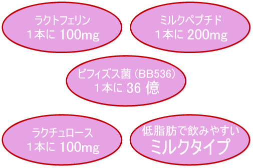 乳の神秘【ラクトフェリン】が、ビフィズス菌を増やす働きにより、おねかの中から家族の健康をサポートします。低脂肪でミルクタイプの新しい、シンバイオティクスです!